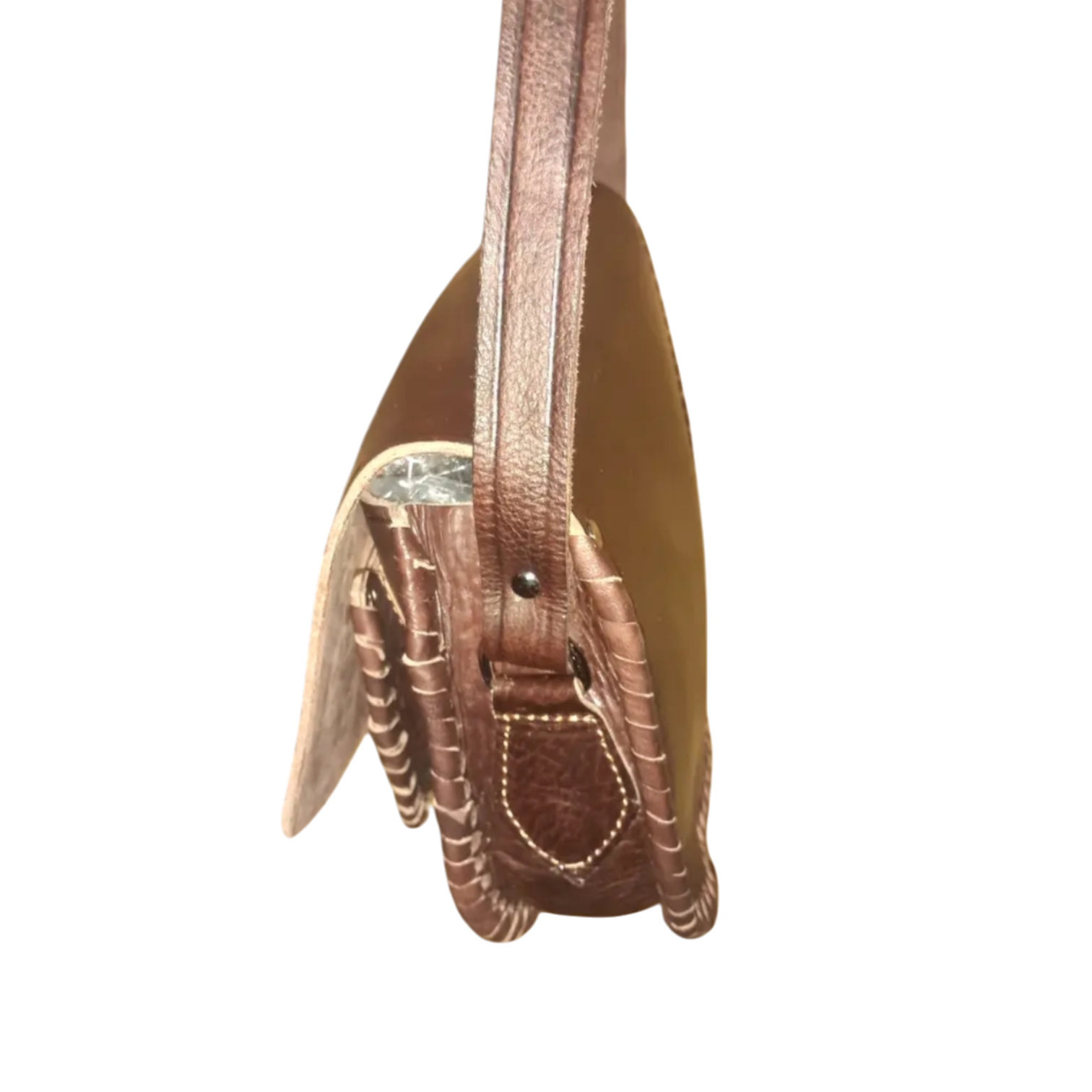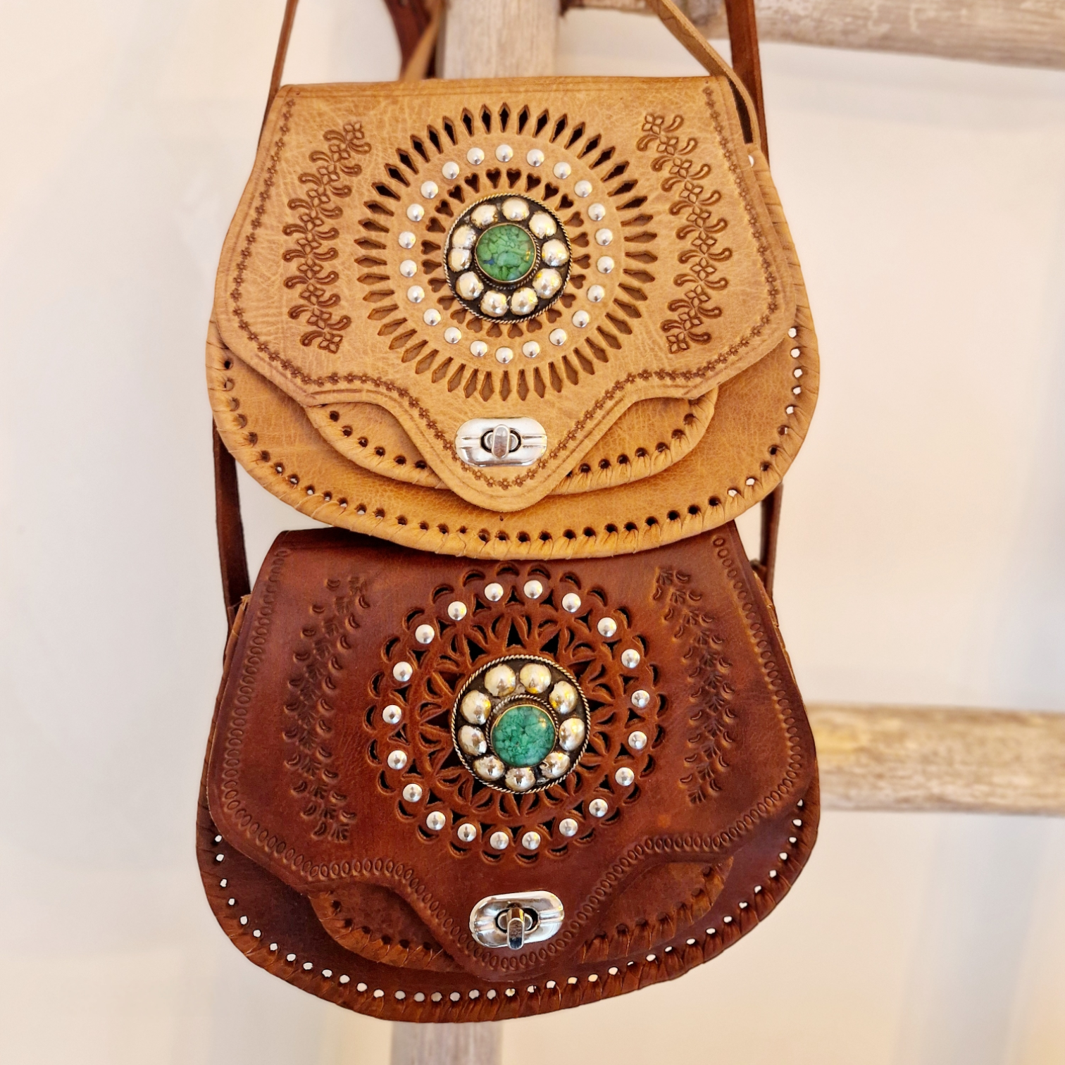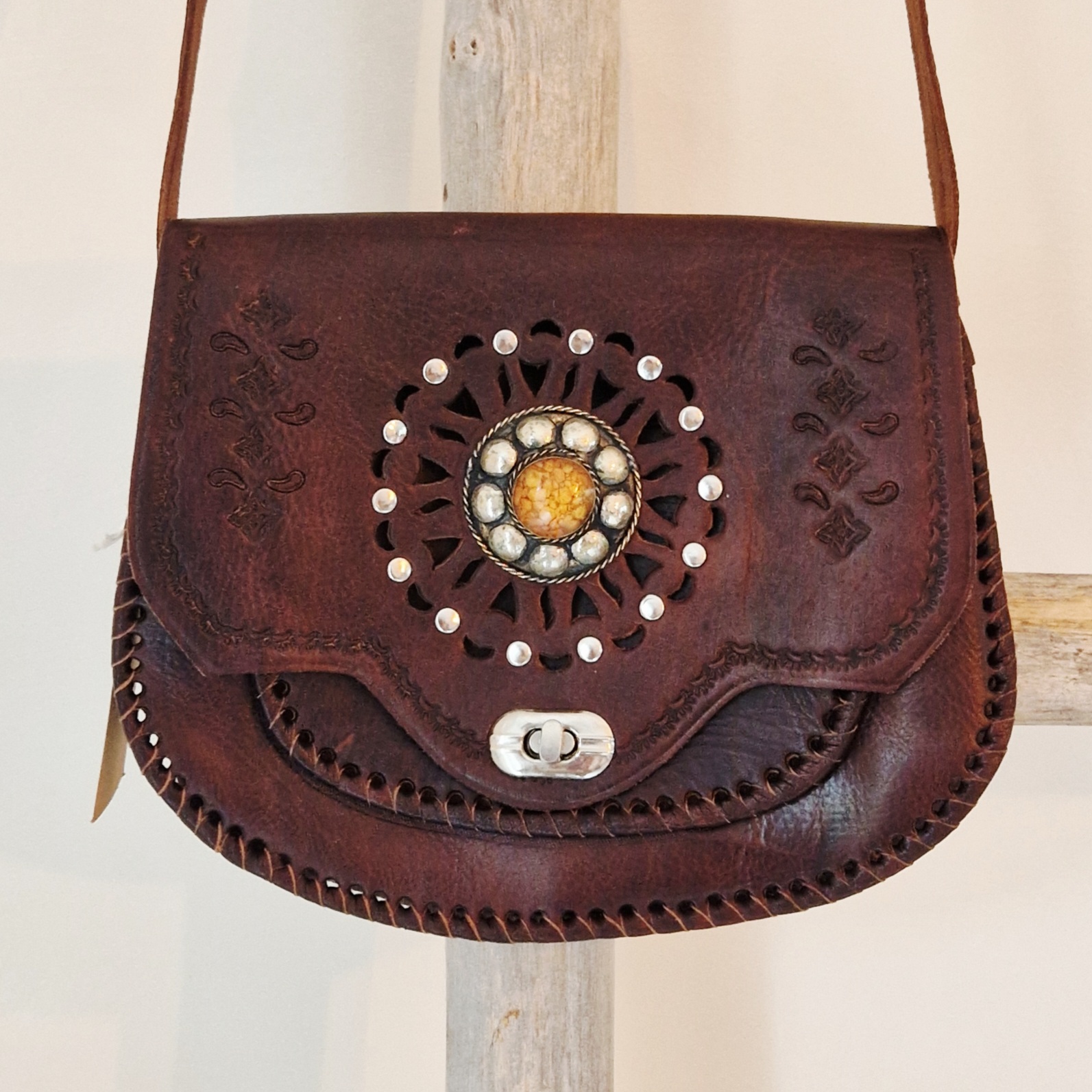 Ronde damestas met gekleurde stenen van zeer goede kwaliteit. Het is een tas met een kliksluiting, waarvan de klep opengewerkt is. Het bestaat uit twee zakken en heeft een metalen sluiting. Afmetingen: 24 x 10 x 19 cm.