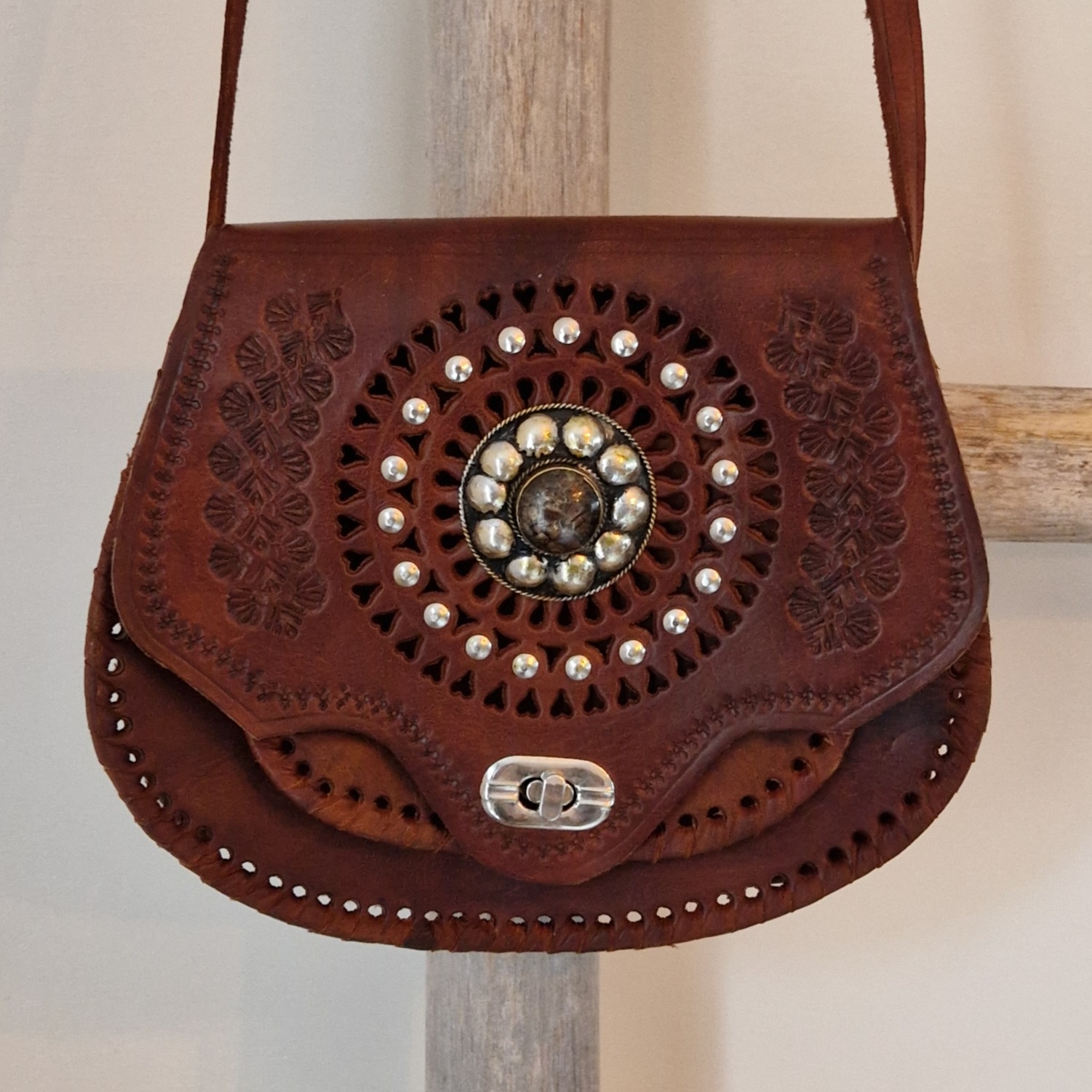 Ronde damestas met gekleurde stenen van zeer goede kwaliteit. Het is een tas met een kliksluiting, waarvan de klep opengewerkt is. Het bestaat uit twee zakken en heeft een metalen sluiting. Afmetingen: 24 x 10 x 19 cm.