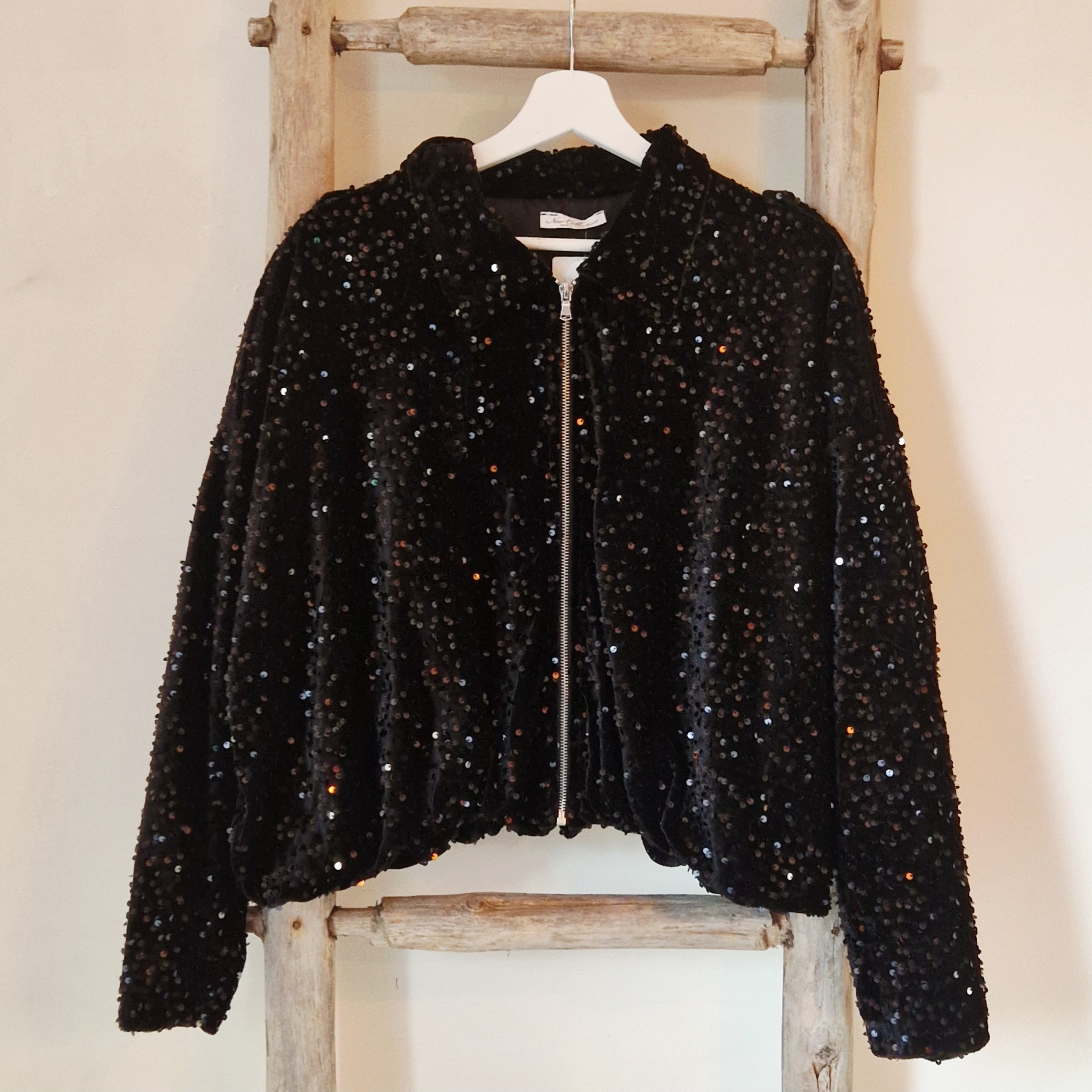 Fluwelen jasje met pailletten Lange mouwen Met ritssluiting Eén maat 36-42 Gemaakt in Italië
