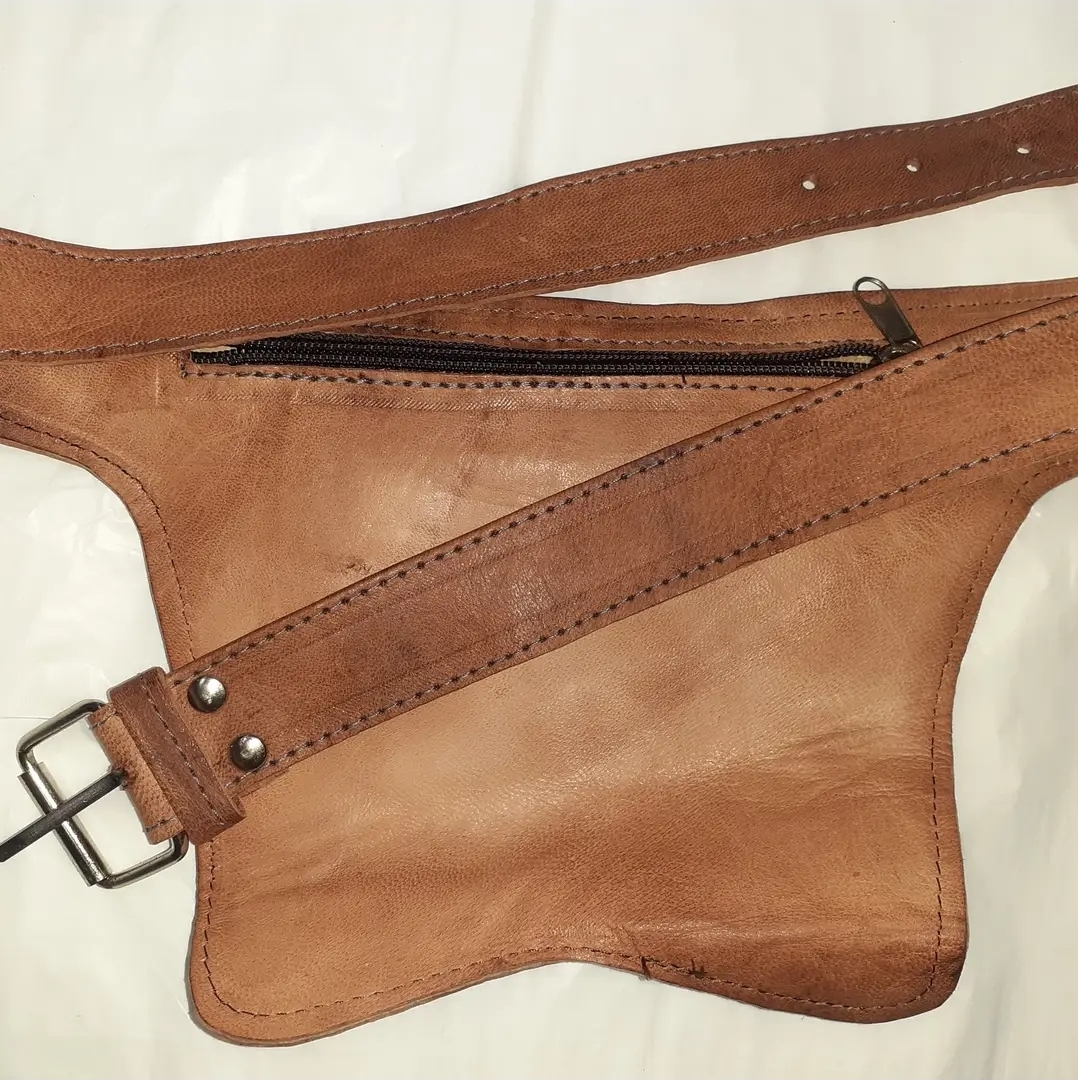 Tasje in de vorm van een slijpschijf gemaakt van rundleer. Het is een heuptasje met een dubbele klep aan de onderkant, twee rits vakken en een centraal vak met een sluiting, bevestigd aan een riem die aan de flap is genaaid. Kleuren kunnen iets afwijken van de foto