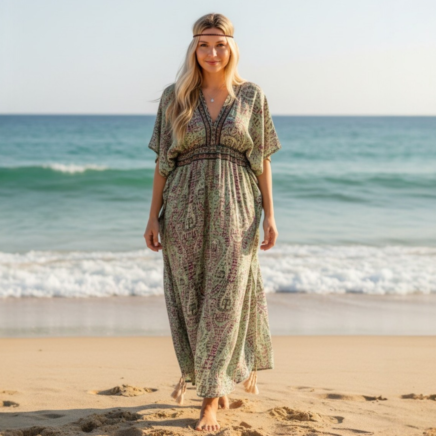 Lange jumpsuit in boho-stijl bedrukt met met tekeningen in groene kleuren met roze details Wijde en lange jumpsuit met korte mouwen. Aan de onderkant is het ongelijk met insnijdingen aan de zijkanten. Het is breed en heeft een pasvorm onder de borst met fijn elastiek. De halslijn is V-vormig en heeft een soortgelijke klep aan de achterkant, waar je hem na een afspraak kunt verstellen door hem te strikken. Samenstelling: 70% zijde en 30% polyester Beschikbaarheid: One size fits all Afmetingen: lengte 135 cm.