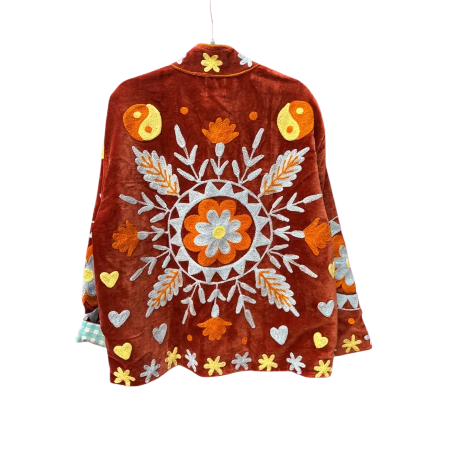 Patronen kunnen altijd iets afwijken van de foto, omdat ieder kledingstuk met de hand is gemaakt. Velvet yingyang is met de hand gemaakt in India, speciaal ontworpen door ToutVintage en geschikt voor wie waarde hecht aan vakmanschap, duurzaamheid en karakter. Elk stuk is uniek en komt uit een gelimiteerde oplage van slechts 250 exemplaren. Dit jacket is gemaakt van velvet stof en geborduurd met de mooiste garen. Alles is zorgvuldig geselecteerd met respect voor mens en planeet. ๐งถ Details Materiaal: Velvet Kleur: brique Pasvorm: Normal Maatvoering: One size - geschikt tm maat 44 Wasvoorschrift: Handwas-stomerij ๐ Waarom dit item? โ๏ธ Handgemaakt in kleine oplage โ๏ธ Eerlijke productie & duurzame materialen