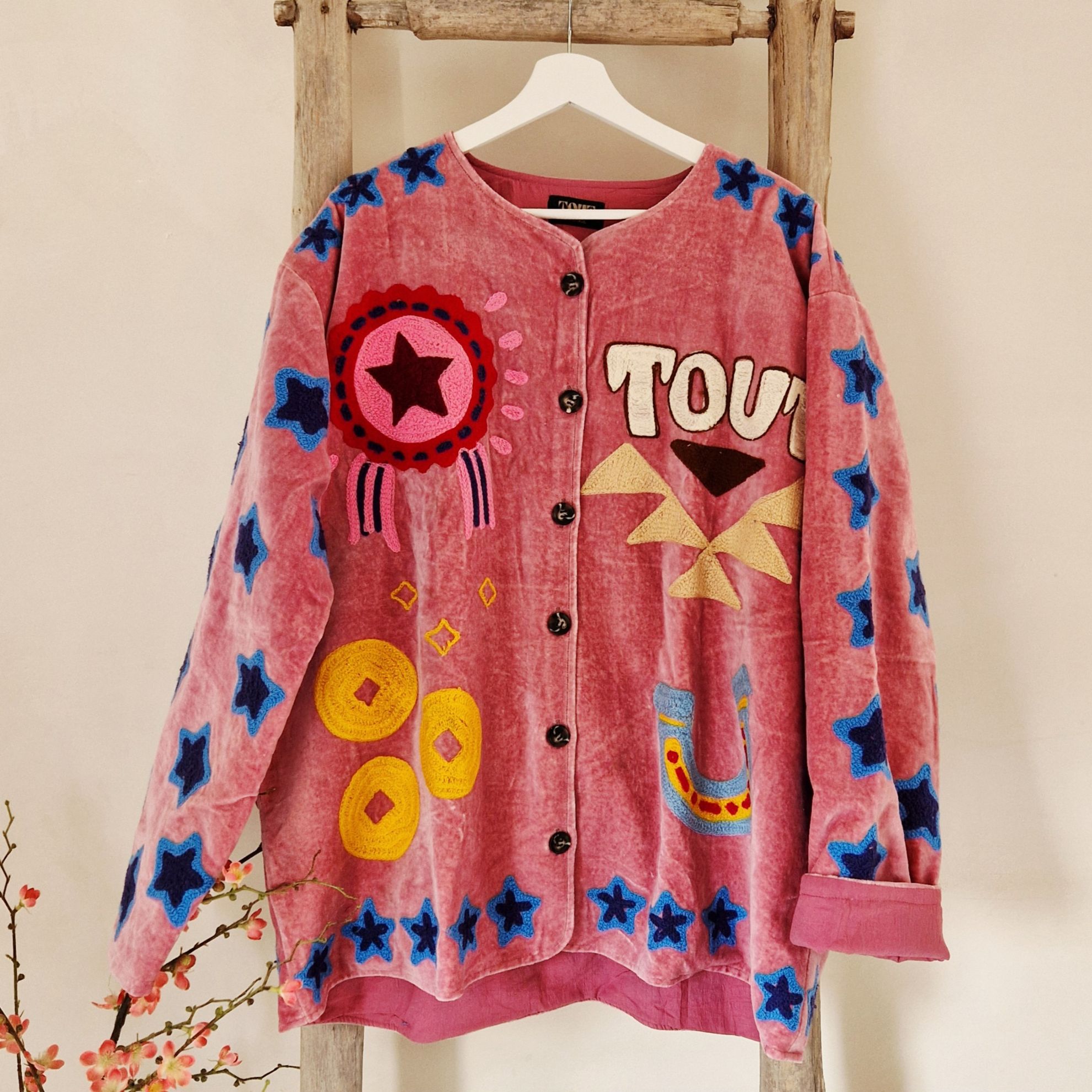 Velvet Jacket Cowboy is met de hand gemaakt in India, speciaal ontworpen door ToutVintage en geschikt voor wie waarde hecht aan vakmanschap, duurzaamheid en karakter. Elk stuk is uniek en komt uit een gelimiteerde oplage van slechts 100 exemplaren. Dit jacket is gemaakt van velvet stof en geborduurd met de mooiste garen. Alles is zorgvuldiggeselecteerd met respect voor mens en planeet. 🧶 Details Materiaal: Velvet Pasvorm: Oversized Maatvoering: One size - geschikt tm maat 46 Wasvoorschrift: Handwas-stomerij 💛 Waarom dit item? ✔️ Handgemaakt in kleine oplage ✔️ Eerlijke productie & duurzame materialen ✔️ Tijdloos design – géén fast fashion