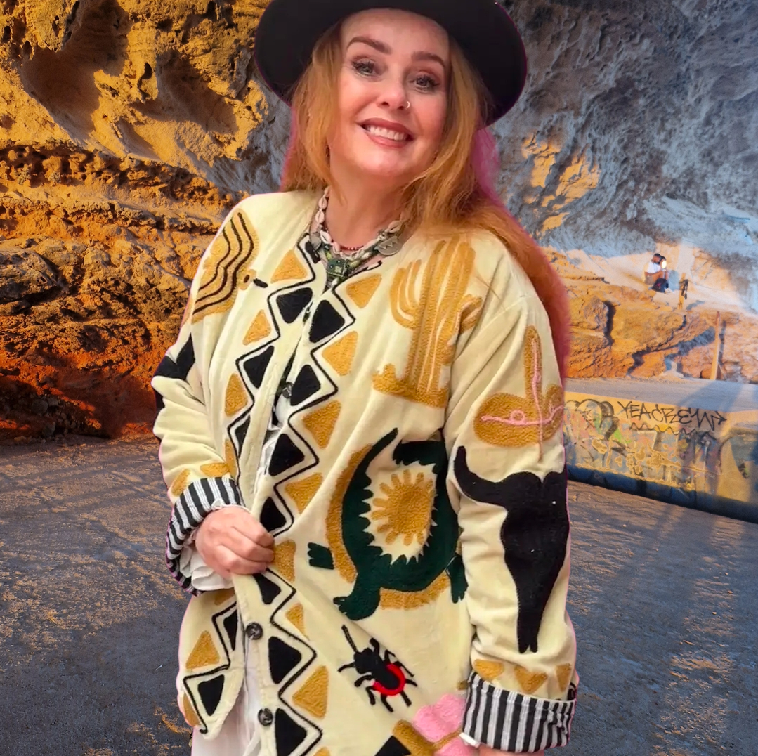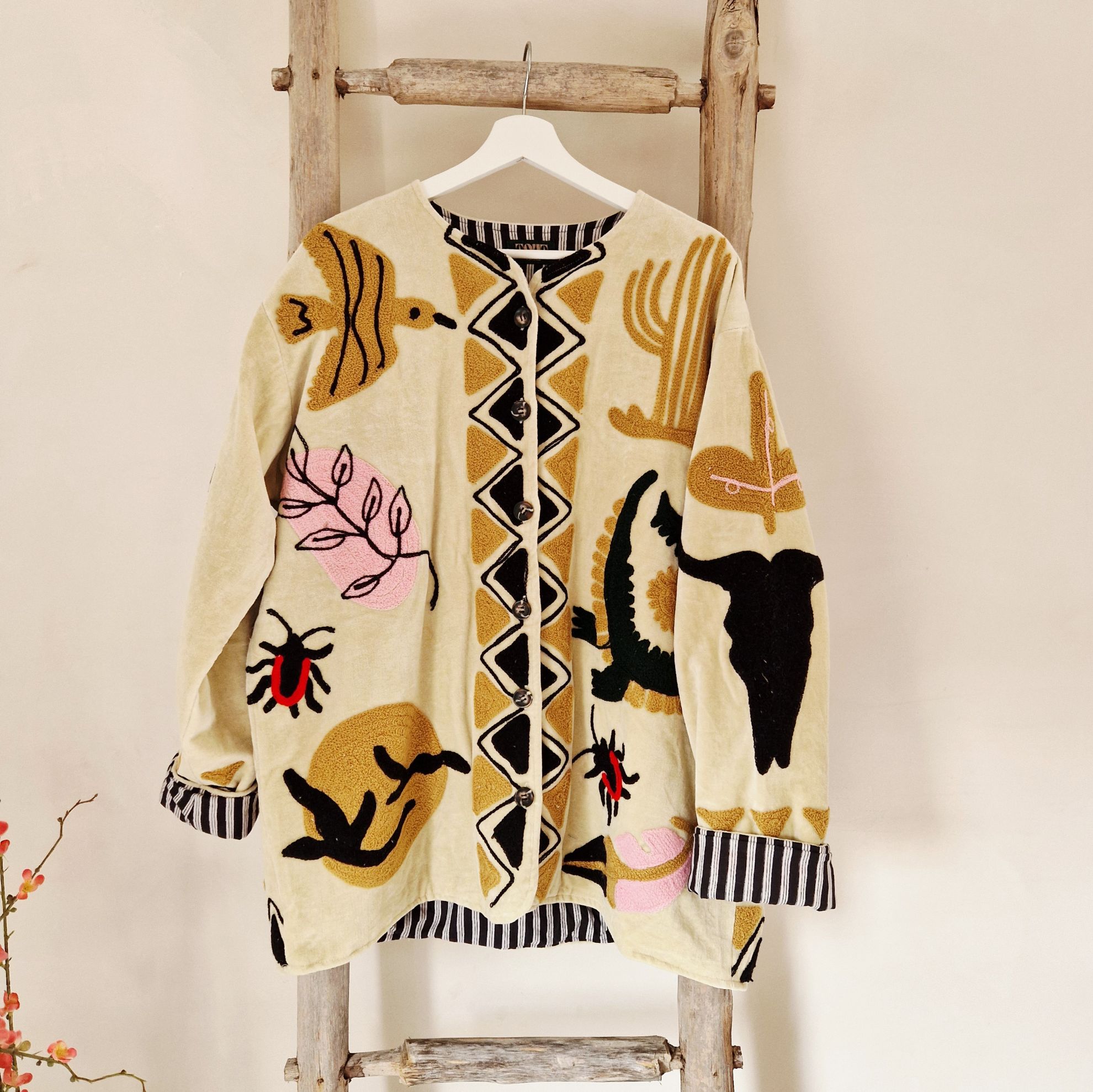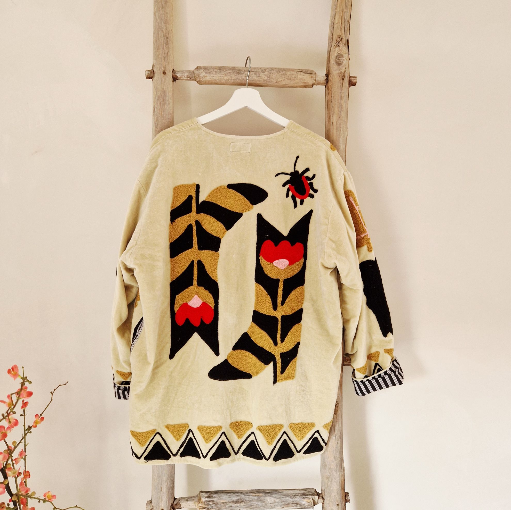 Patronen kunnen altijd iets afwijken van de foto, omdat ieder kledingstuk met de hand is gemaakt. Velvet Jacket Boots crème is met de hand gemaakt in India, speciaal ontworpen door ToutVintage en geschikt voor wie waarde hecht aan vakmanschap, duurzaamheid en karakter. Elk stuk is uniek en komt uit een gelimiteerde oplage van slechts 100 exemplaren. Dit jacket is gemaakt van velvet stof en geborduurd met de mooiste garen. Alles is zorgvuldig geselecteerd met respect voor mens en planeet. Rug lengte 75 cm oksel tot oksel 60 cm Draagbaar tot maat 46