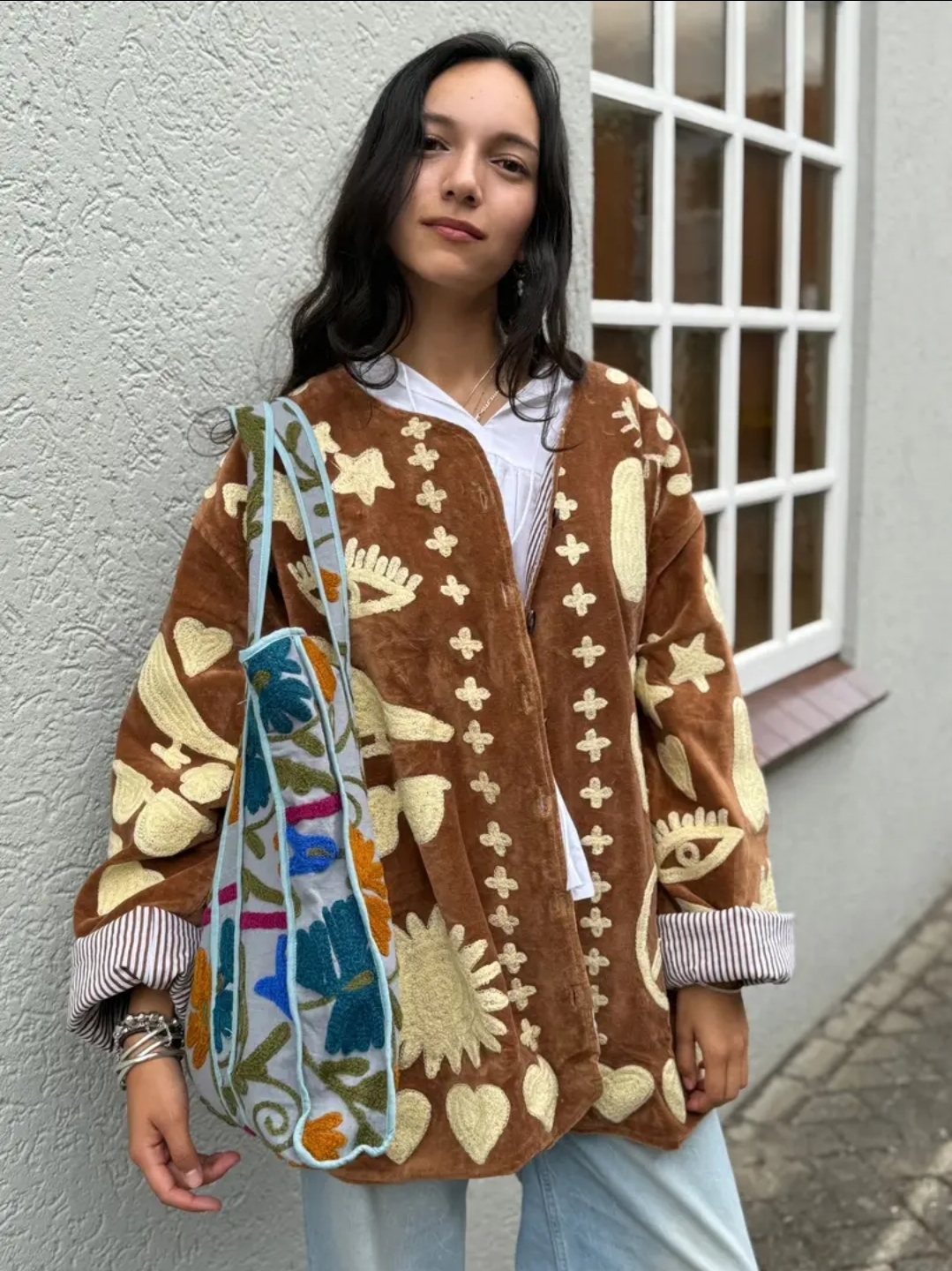 Patronen kunnen altijd iets afwijken van de foto, omdat ieder kledingstuk met de hand is gemaakt. Velvet Jacket DREAM brown creme is met de hand gemaakt in India, speciaal ontworpen door ToutVintage en geschikt voor wie waarde hecht aan vakmanschap, duurzaamheid en karakter. Elk stuk is uniek en komt uit een gelimiteerde oplage van slechts 100 exemplaren. Dit jacket is gemaakt van velvet stof en geborduurd met de mooiste garen. Alles is zorgvuldig geselecteerd met respect voor mens en planeet.