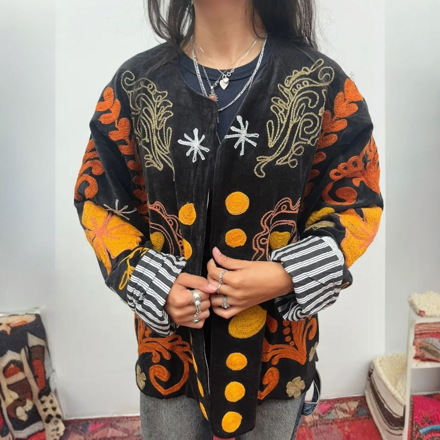 Patronen kunnen altijd iets afwijken van de foto, omdat ieder kledingstuk met de hand is gemaakt. Velvet Jacket is met de hand gemaakt in India, speciaal ontworpen door ToutVintage en geschikt voor wie waarde hecht aan vakmanschap, duurzaamheid en karakter. Elk stuk is uniek en komt uit een gelimiteerde oplage van slechts 100 exemplaren. Dit jacket is gemaakt van velvet stof en geborduurd met de mooiste garen. Alles is zorgvuldig geselecteerd met respect voor mens en planeet. ๐งถ Details Materiaal: Velvet Kleur: brown creme Pasvorm: Oversized Maatvoering: One size - geschikt tm maat 46/48 Wasvoorschrift: Handwas-stomerij ๐ Waarom dit item? โ๏ธ Handgemaakt in kleine oplage โ๏ธ Eerlijke productie & duurzame materialen