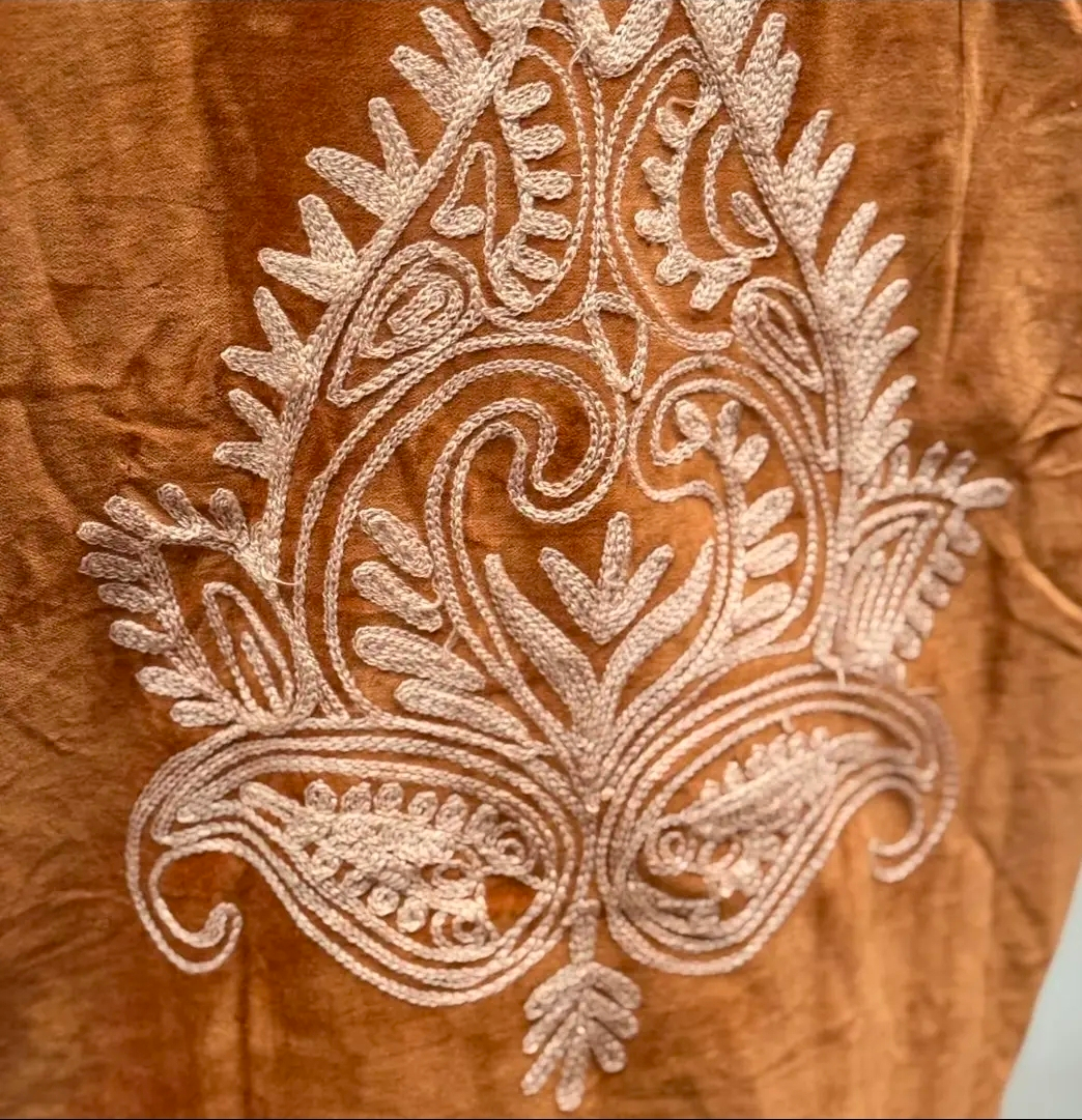 Patronen kunnen altijd iets afwijken van de foto, omdat ieder kledingstuk met de hand is gemaakt. Velvet Jacket is met de hand gemaakt in India, speciaal ontworpen door ToutVintage en geschikt voor wie waarde hecht aan vakmanschap, duurzaamheid en karakter. Elk stuk is uniek en komt uit een gelimiteerde oplage van beperkte exemplaren. Dit jacket is gemaakt van velvet stof en geborduurd met de mooiste garen. Alles is zorgvuldig geselecteerd met respect voor mens en planeet. ๐งถ Details Materiaal: Velvet Kleur: brown Pasvorm: Oversized Maatvoering: One size - geschikt tm maat 46 Wasvoorschrift: Handwas-stomerij ๐ Waarom dit item? โ๏ธ Handgemaakt in kleine oplage โ๏ธ Eerlijke productie & duurzame materialen