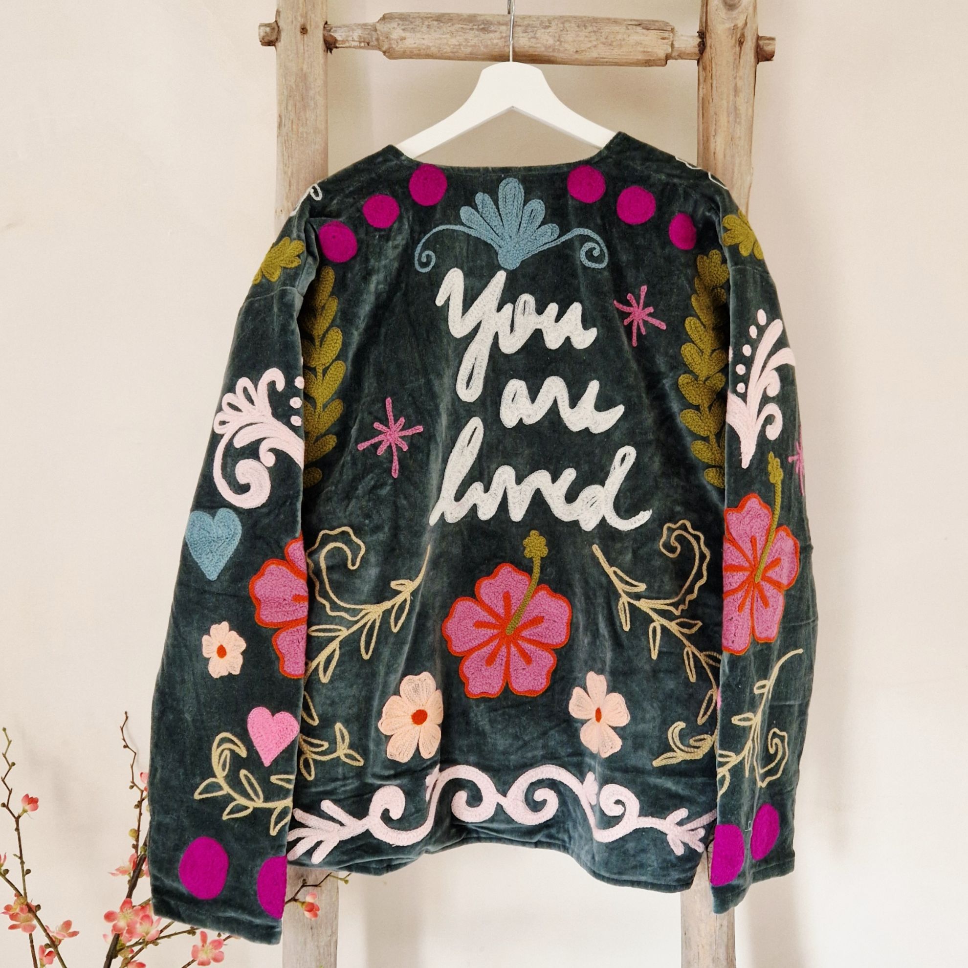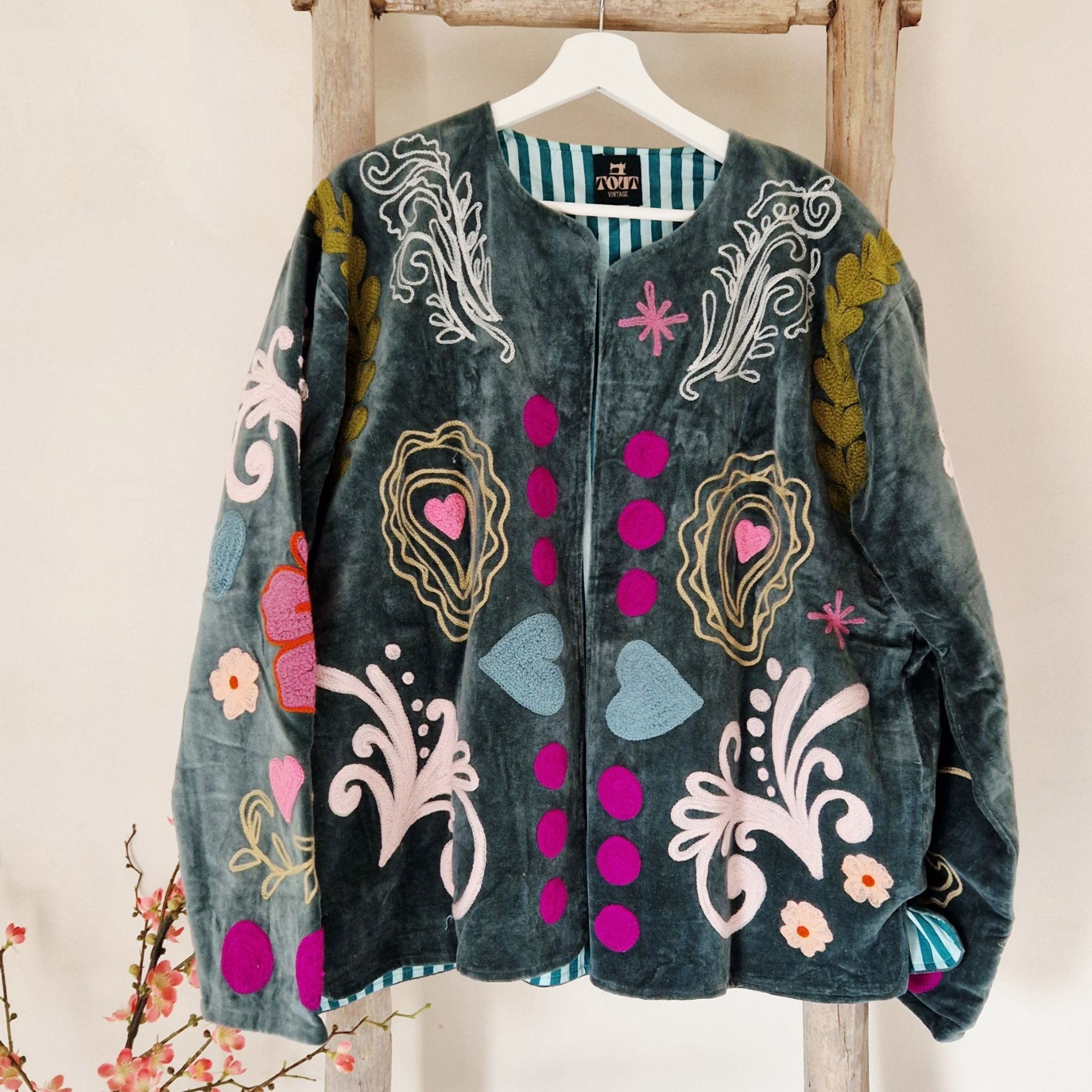 Velvet Jacket You are Loved is met de hand gemaakt in India, speciaal ontworpen door ToutVintage en geschikt voor wie waarde hecht aan vakmanschap, duurzaamheid en karakter. Elk stuk is uniek en komt uit een gelimiteerde oplage van slechts 100 exemplaren. Dit jacket is gemaakt van velvet stof en geborduurd met de mooiste garen. Alles is zorgvuldiggeselecteerd met respect voor mens en planeet. 🧶 Details Materiaal: Velvet Pasvorm: Oversized Maatvoering: One size - geschikt tm maat 46 Wasvoorschrift: Handwas-stomerij 💛 Waarom dit item? ✔️ Handgemaakt in kleine oplage ✔️ Eerlijke productie & duurzame materialen ✔️ Tijdloos design – géén fast fashion