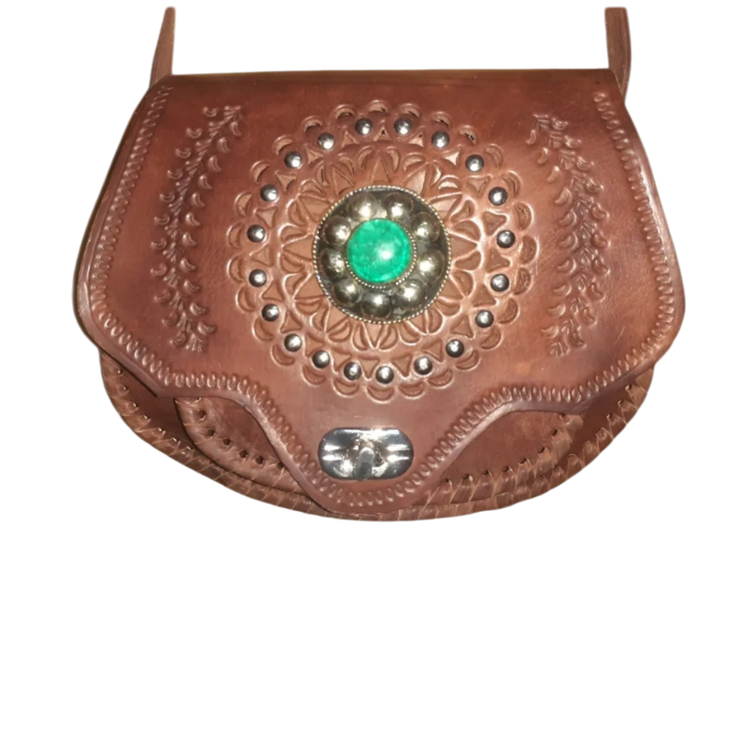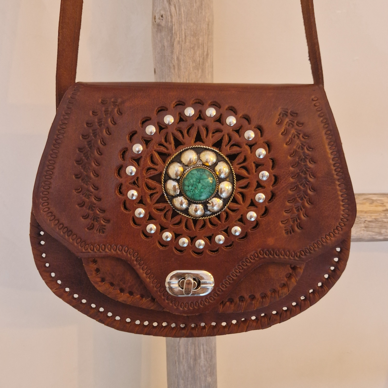 Ronde damestas met gekleurde stenen van zeer goede kwaliteit. Het is een tas met een kliksluiting, waarvan de klep opengewerkt is. Het bestaat uit twee zakken en heeft een metalen sluiting. Afmetingen: 24 x 10 x 19 cm.