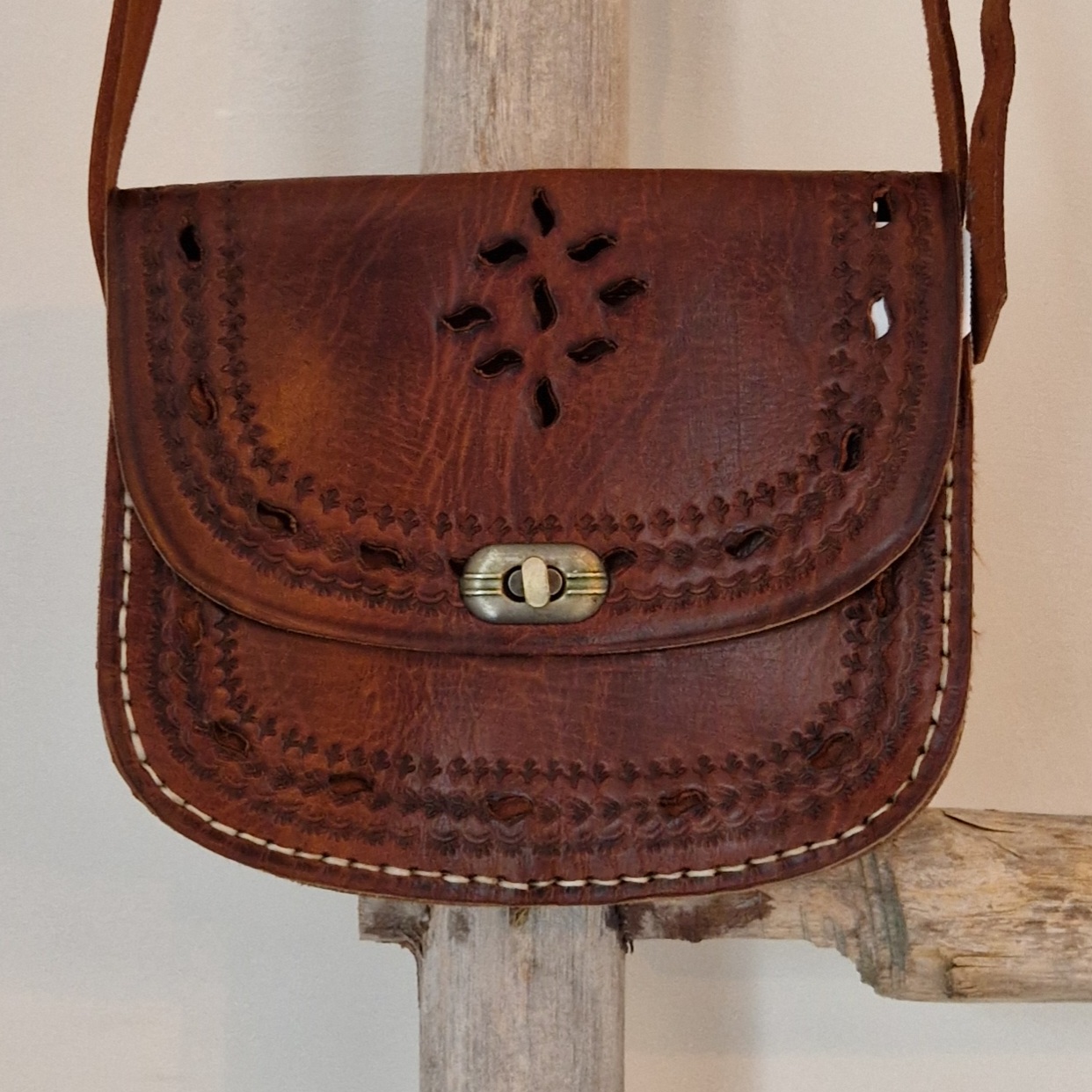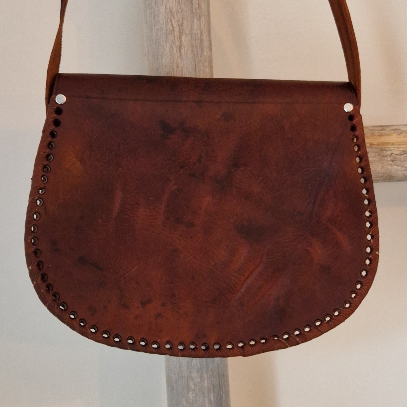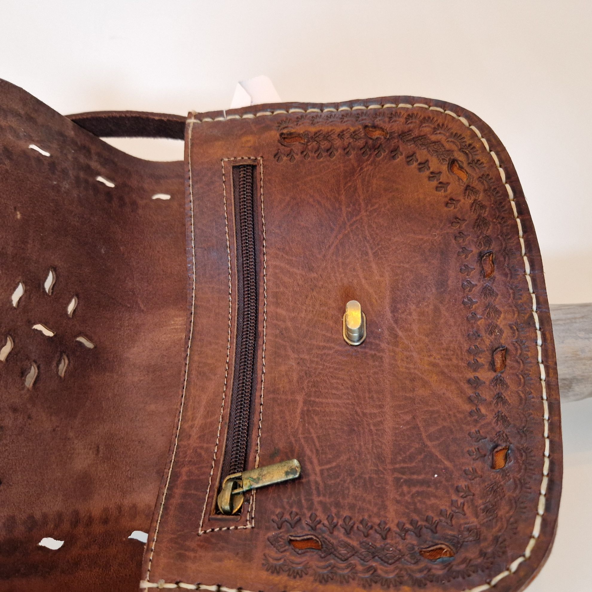 Boho tas gemaakt van rundleer van zeer goede kwaliteit die bestaat uit twee zakken, waarvan het voor vak met ritssluiting. De klep is geperforeerd en sluit met een klik. Afmetingen: • Afmetingen: 19 x 7 x 16 cm