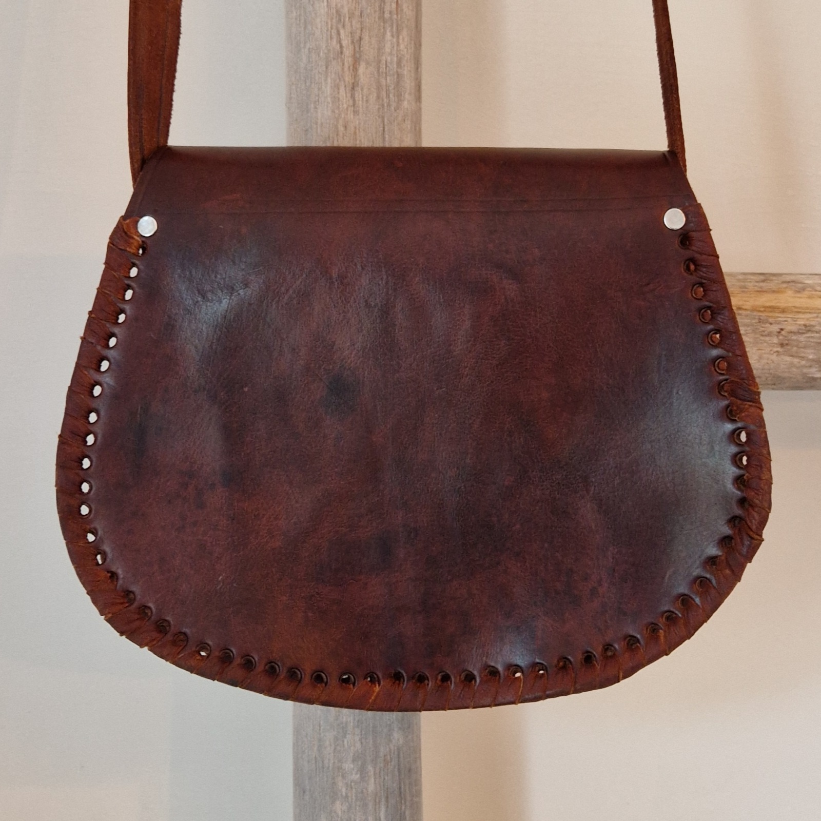 Ronde damestas met gekleurde stenen van zeer goede kwaliteit. Het is een tas met een kliksluiting, waarvan de klep opengewerkt is. Het bestaat uit twee zakken en heeft een metalen sluiting. Afmetingen: 24 x 10 x 19 cm.
