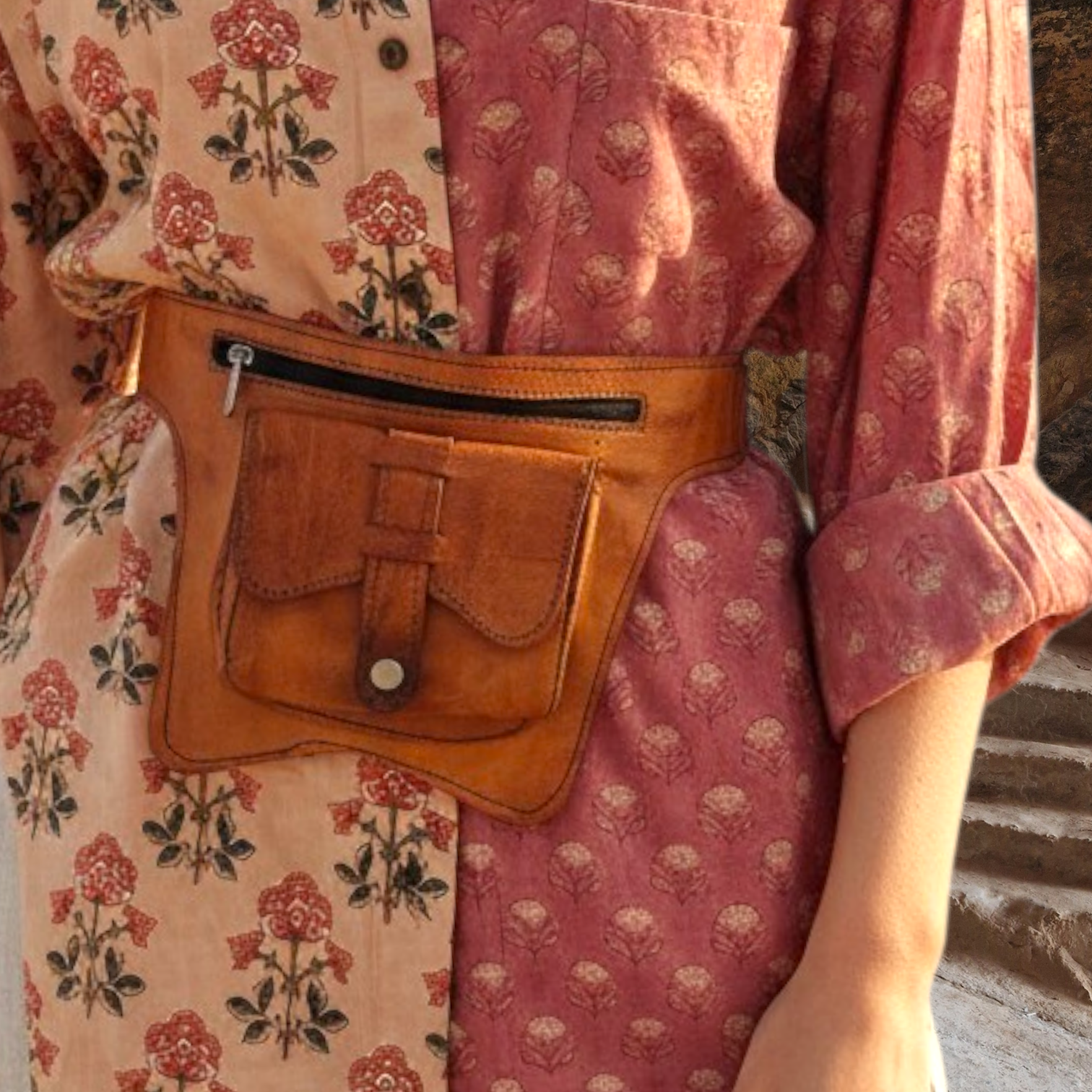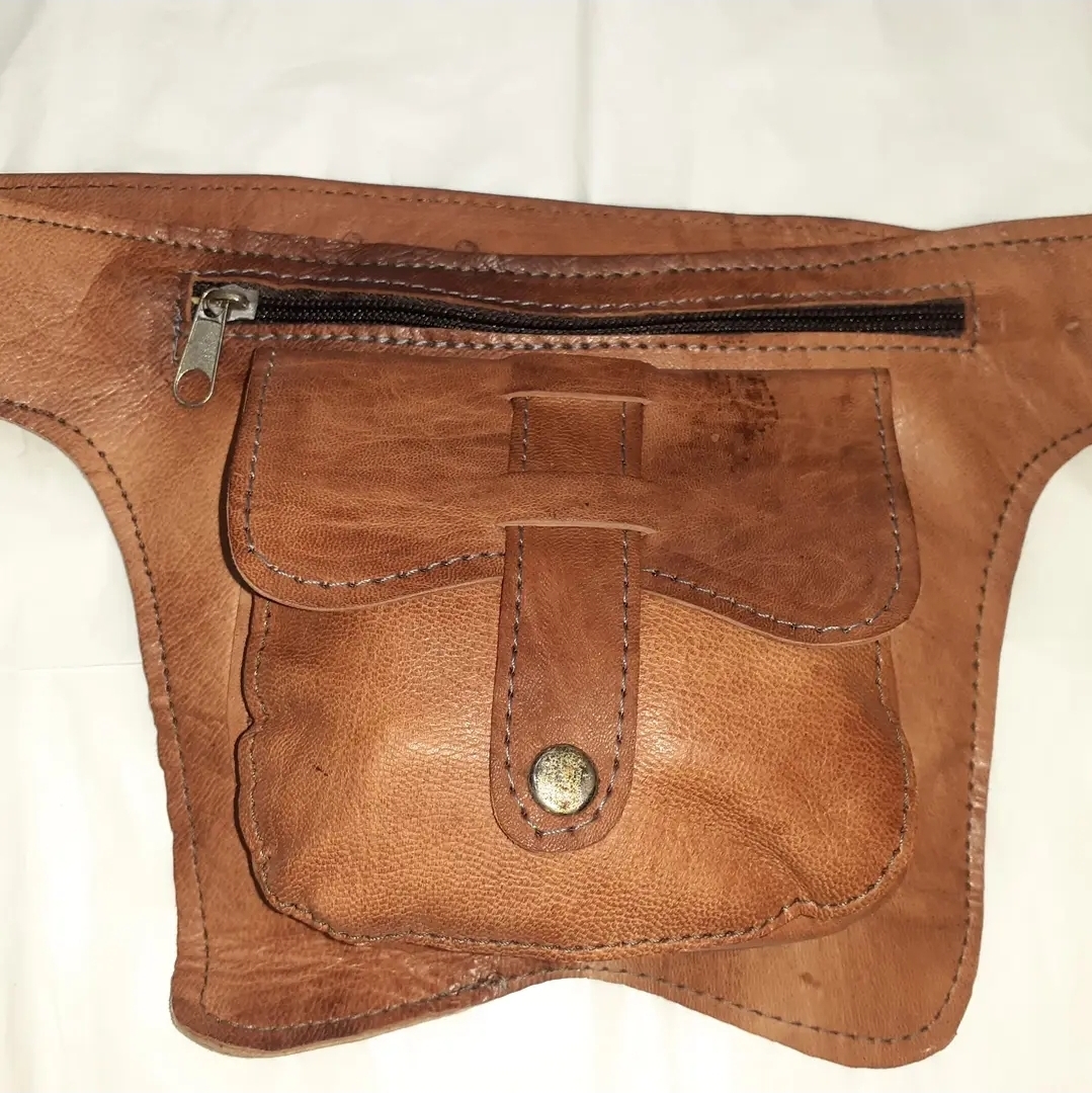 Tasje in de vorm van een slijpschijf gemaakt van rundleer. Het is een heuptasje met een dubbele klep aan de onderkant, twee rits vakken en een centraal vak met een sluiting, bevestigd aan een riem die aan de flap is genaaid. Kleuren kunnen iets afwijken van de foto