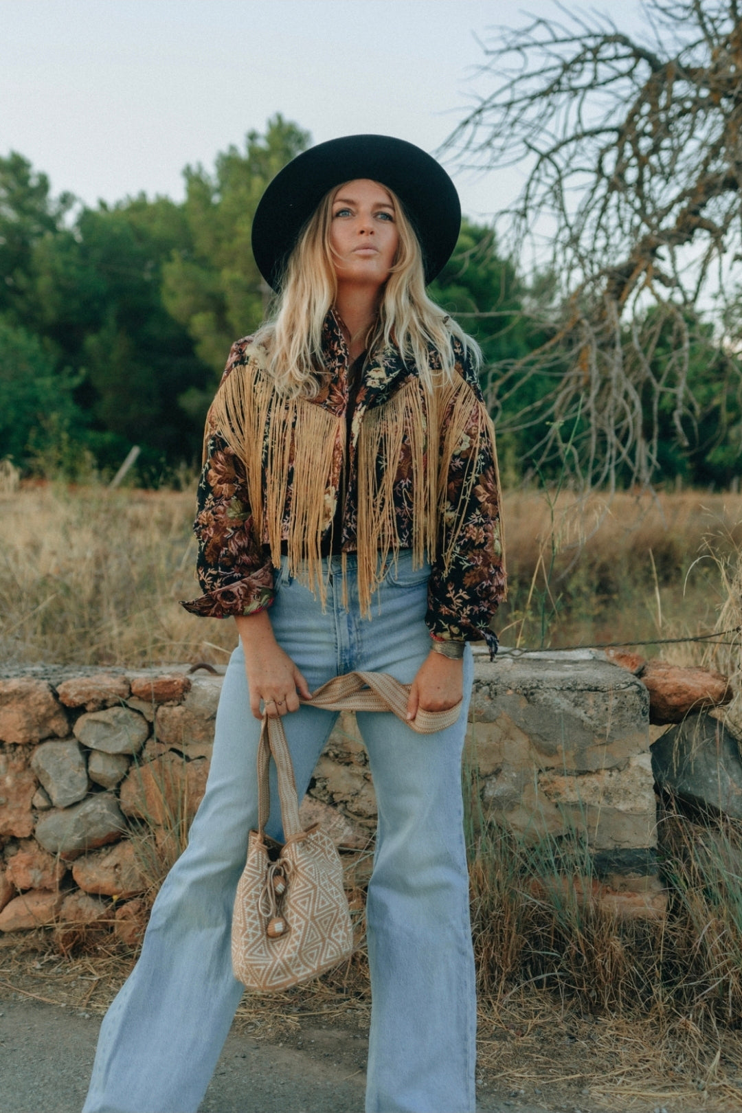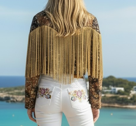 Prachtige jas gemaakt van een stevige jacquardstof met een fantastische katoenen voering. Cowgirl-stijl met franjes. Geschikt voor maat XS tot M. Let op: elke jas kan iets verschillen, omdat de print niet altijd op dezelfde plek zit. Alles is zorgvuldig geselecteerd met respect voor mens en planeet.