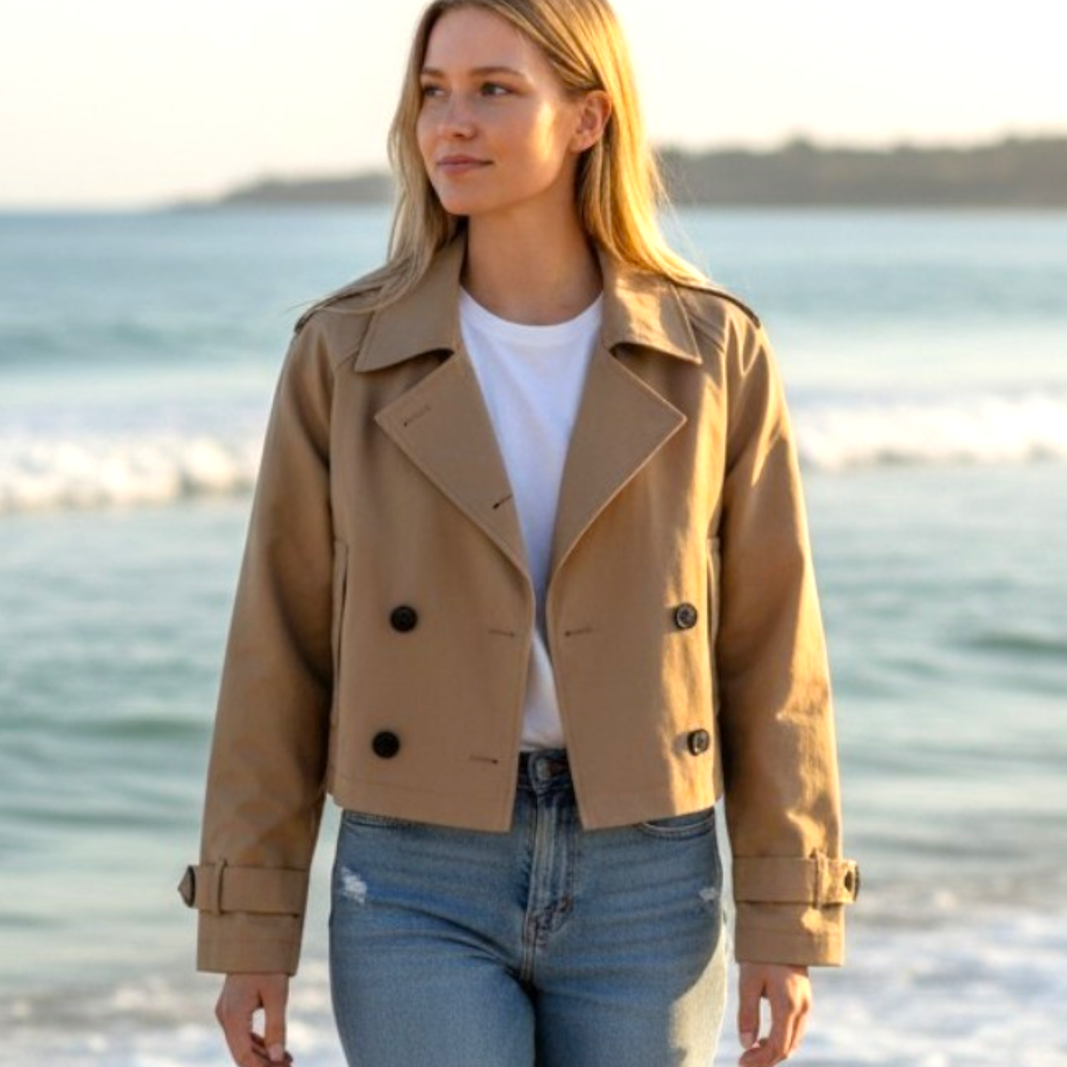 Kort trenchcoat jasje effen kleur licht bruin verkrijgbaar in de maten S t/m L 100% polyster