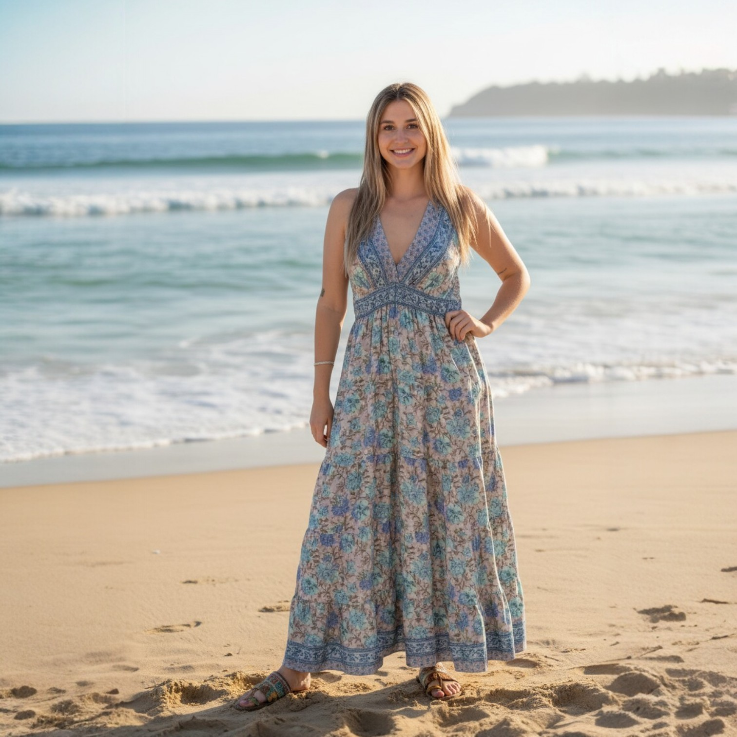 Lange jurk met dunne bandjes en strik tot strik achter de hals Het heeft breed elastiek aan de achterkant en ruches aan de onderkant Samenstelling: 70% zijde en 30% polyester Lengte: ongeveer 140 cm omdat de bandjes verstelbaar zijn. Maat: Eén maat