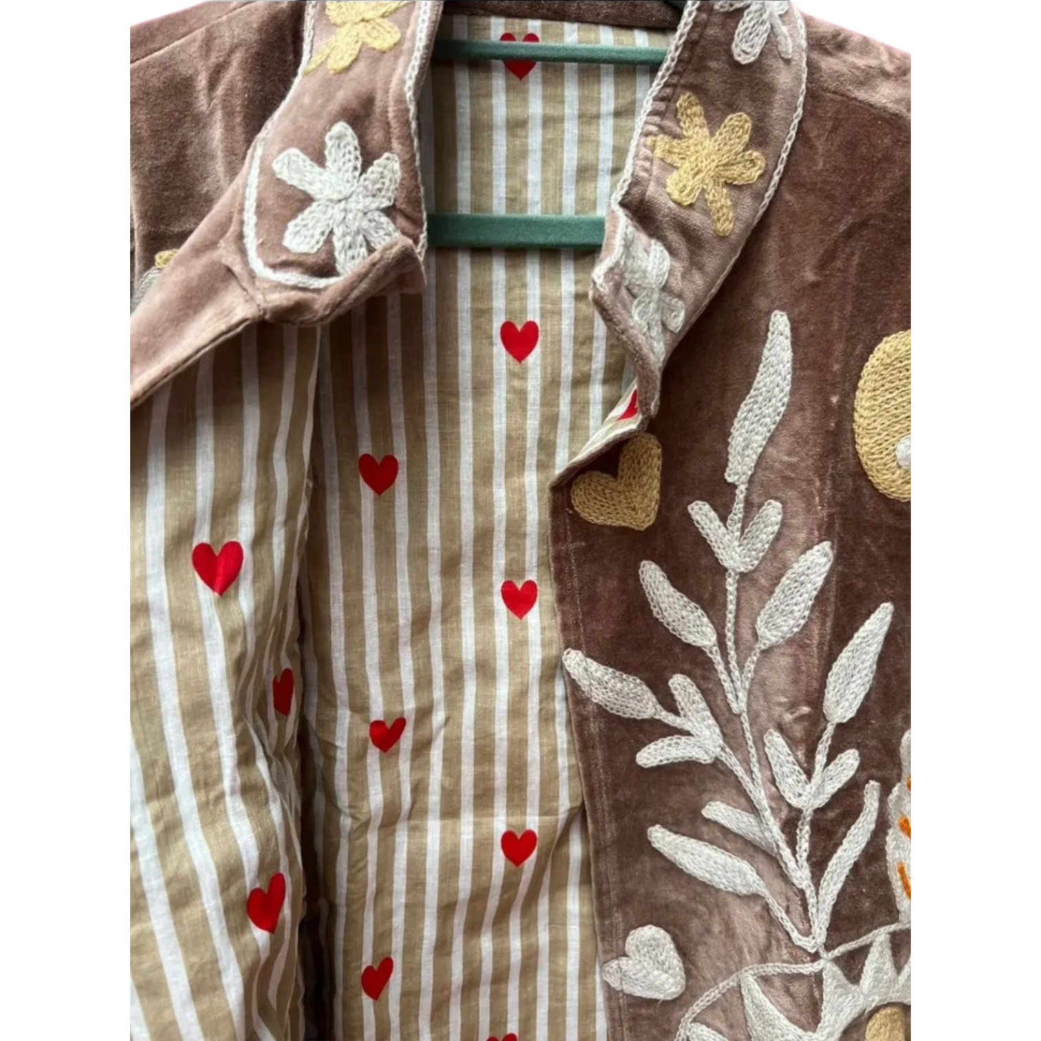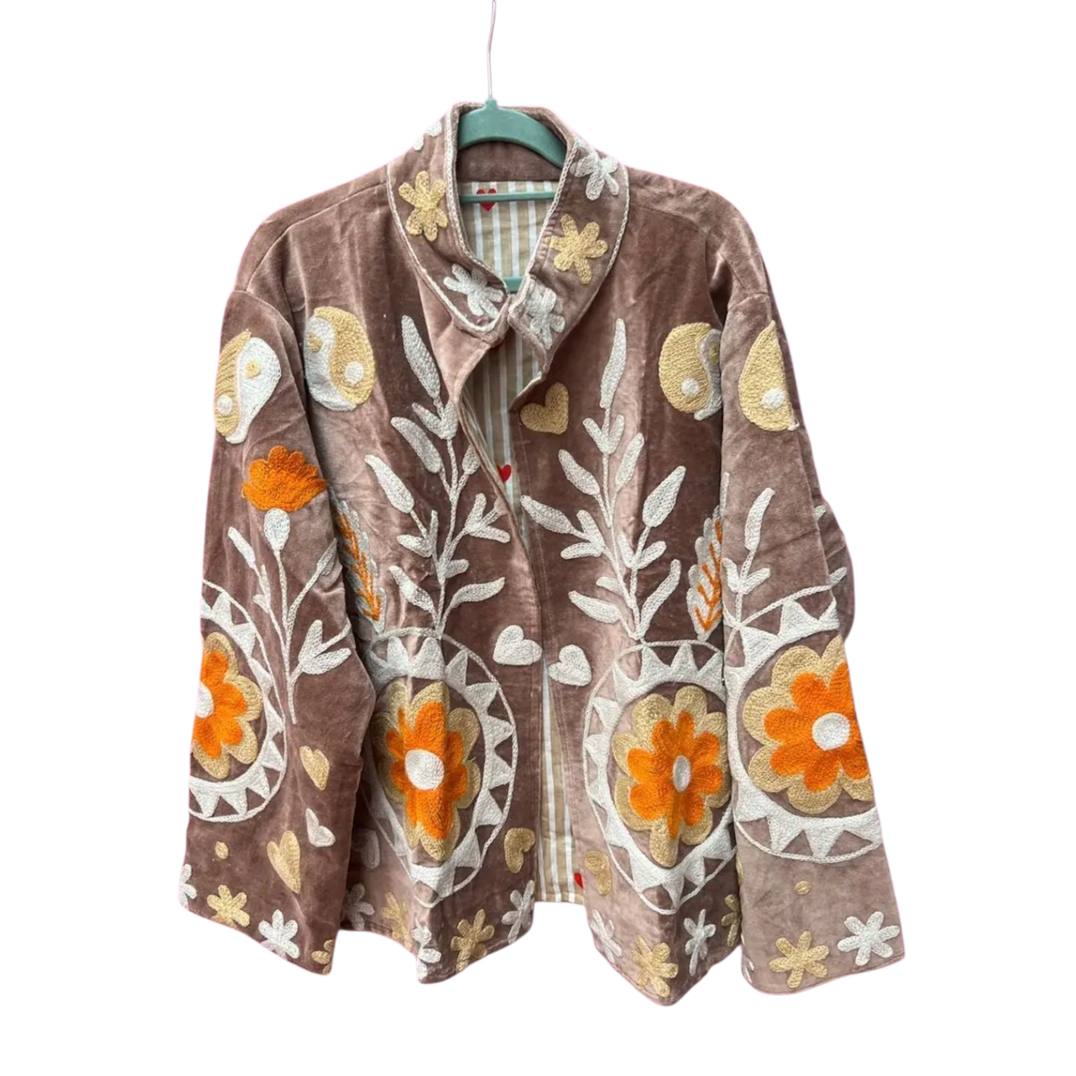 Patronen kunnen altijd iets afwijken van de foto, omdat ieder kledingstuk met de hand is gemaakt. Velvet yingyang is met de hand gemaakt in India, speciaal ontworpen door ToutVintage en geschikt voor wie waarde hecht aan vakmanschap, duurzaamheid en karakter. Elk stuk is uniek en komt uit een gelimiteerde oplage van slechts 250 exemplaren. Dit jacket is gemaakt van velvet stof en geborduurd met de mooiste garen. Alles is zorgvuldig geselecteerd met respect voor mens en planeet. ๐งถ Details Materiaal: Velvet Kleur: brique Pasvorm: Normal Maatvoering: One size - geschikt tm maat 44 Wasvoorschrift: Handwas-stomerij ๐ Waarom dit item? โ๏ธ Handgemaakt in kleine oplage โ๏ธ Eerlijke productie & duurzame materialen
