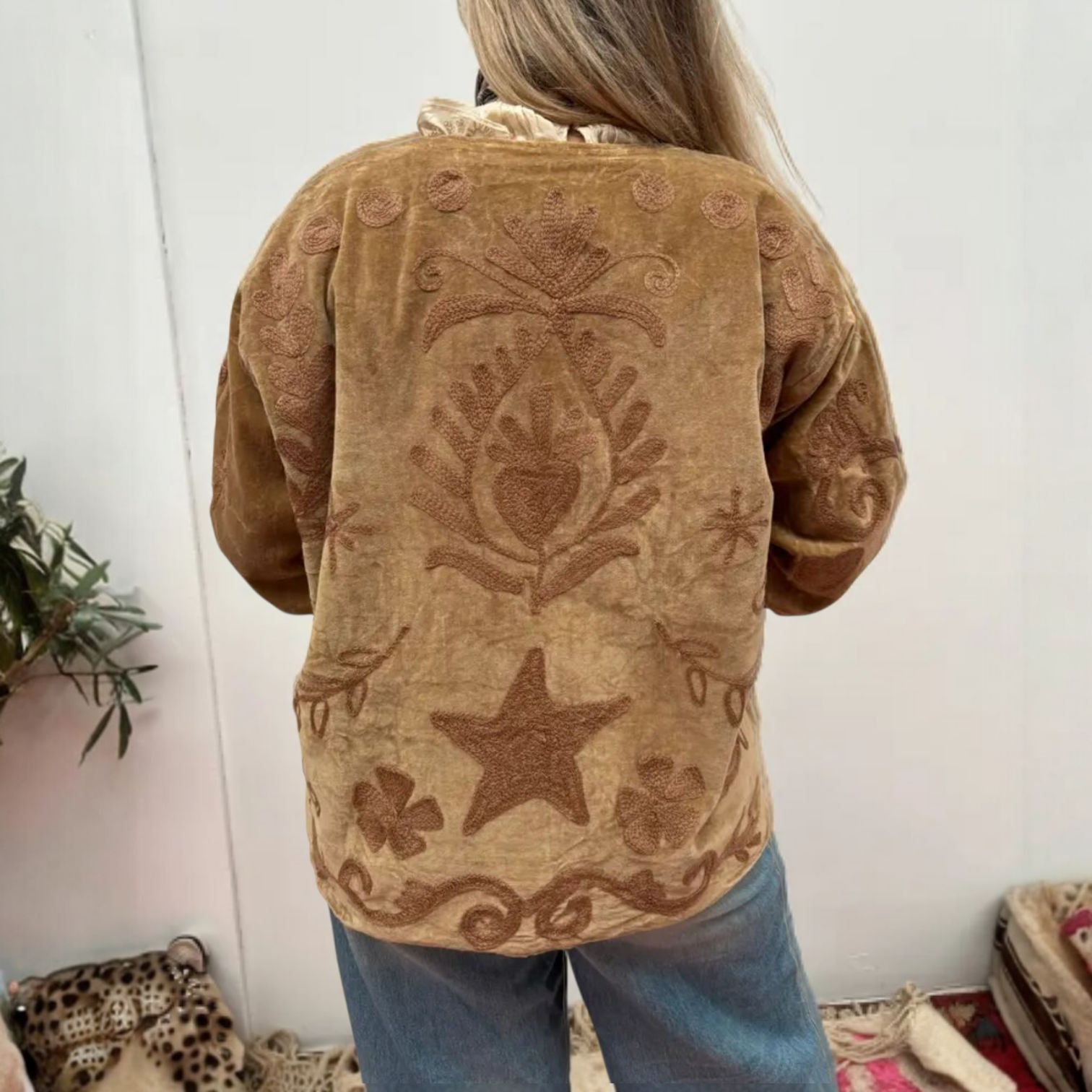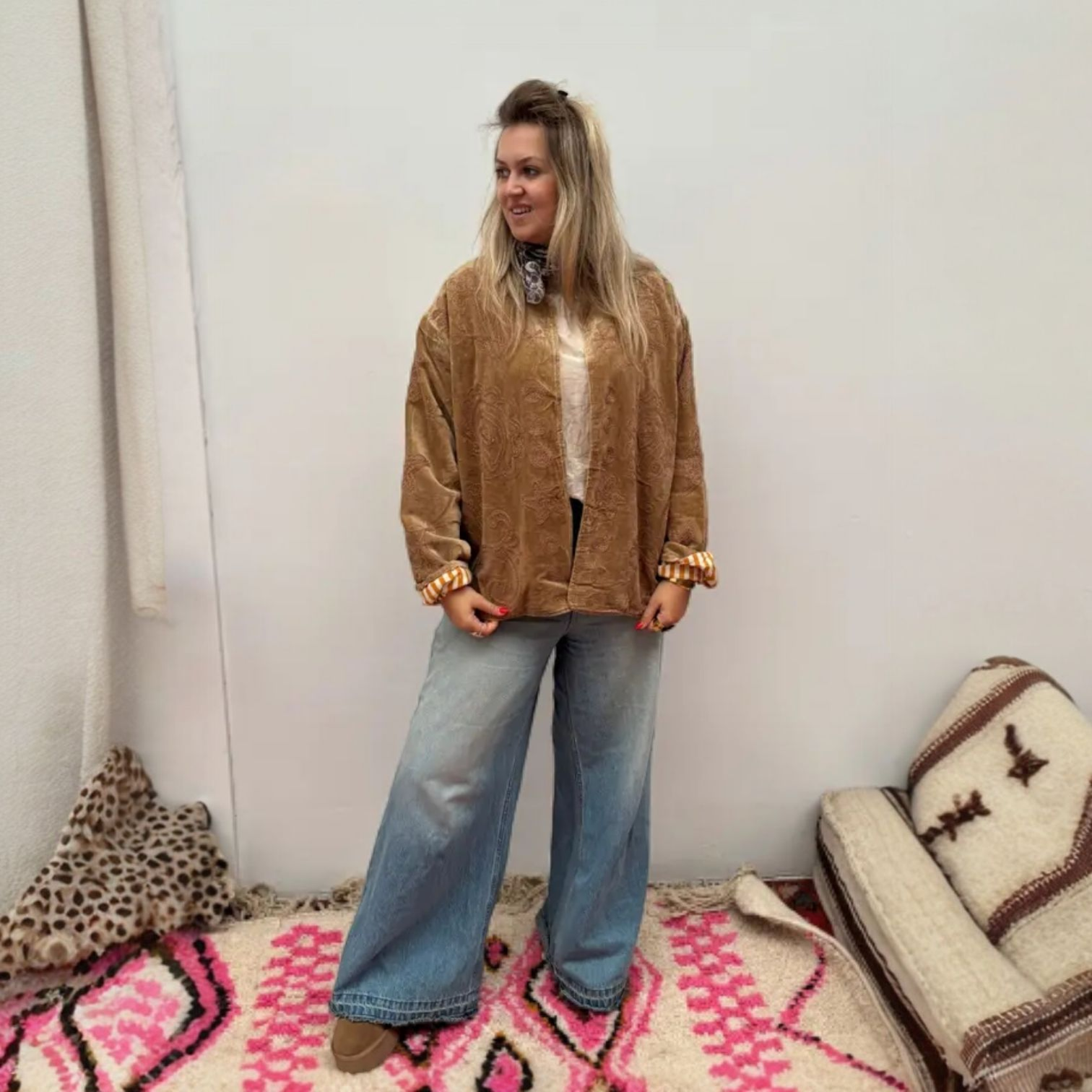 Patronen kunnen altijd iets afwijken van de foto, omdat ieder kledingstuk met de hand is gemaakt. Velvet Jacket is met de hand gemaakt in India, speciaal ontworpen door ToutVintage en geschikt voor wie waarde hecht aan vakmanschap, duurzaamheid en karakter. Elk stuk is uniek en komt uit een gelimiteerde oplage van beperkte exemplaren. Dit jacket is gemaakt van velvet stof en geborduurd met de mooiste garen. Alles is zorgvuldig geselecteerd met respect voor mens en planeet. ๐งถ Details Materiaal: Velvet Kleur: brown Pasvorm: Oversized Maatvoering: One size - geschikt tm maat 46/48 Wasvoorschrift: Handwas-stomerij ๐ Waarom dit item? โ๏ธ Handgemaakt in kleine oplage โ๏ธ Eerlijke productie & duurzame materialen