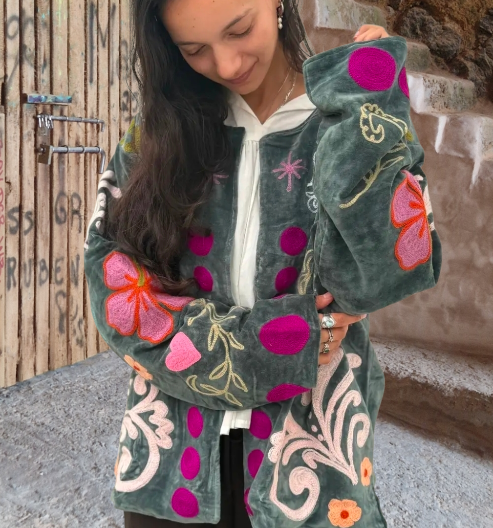 Velvet Jacket You are Loved is met de hand gemaakt in India, speciaal ontworpen door ToutVintage en geschikt voor wie waarde hecht aan vakmanschap, duurzaamheid en karakter. Elk stuk is uniek en komt uit een gelimiteerde oplage van slechts 100 exemplaren. Dit jacket is gemaakt van velvet stof en geborduurd met de mooiste garen. Alles is zorgvuldiggeselecteerd met respect voor mens en planeet. 🧶 Details Materiaal: Velvet Pasvorm: Oversized Maatvoering: One size - geschikt tm maat 46 Wasvoorschrift: Handwas-stomerij 💛 Waarom dit item? ✔️ Handgemaakt in kleine oplage ✔️ Eerlijke productie & duurzame materialen ✔️ Tijdloos design – géén fast fashion