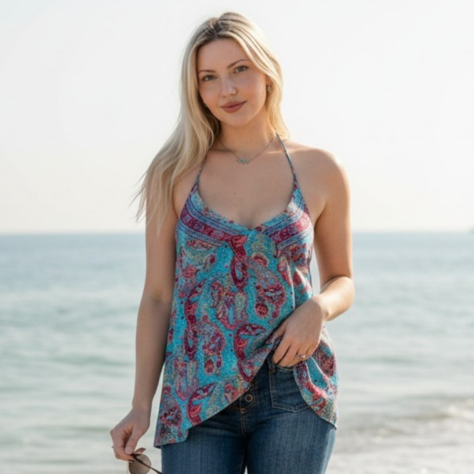 Ideale zomerblouse gemaakt van zijde met een lichtblauwe achtergrond met etnische tekeningen in rode tinten. Top voor dames met open rug Het heeft een grip achter de hals die eindigt met pompons en een breed lint van dezelfde stof dat om de rug is geknoopt. De voorkant heeft twee overlappende stoffen die eindigen in een onregelmatige vorm. Samenstelling: 70% zijde en 30% polyester Verkrijgbaar in: one size fits all Afmetingen: ca. 55 cm. lang + riempjes op het langste deel
